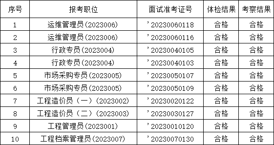 根據(jù)《亳州魏武國(guó)有資本投資控股集團(tuán)有限公司2023年工作人員公開(kāi)招聘》相關(guān)規(guī)定,現(xiàn)將擬入圍對(duì)象體檢、考察結(jié)果公示如下: