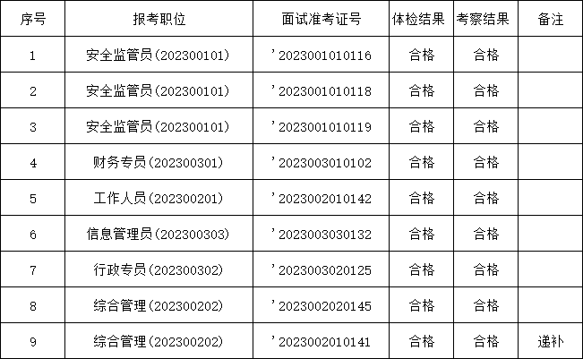 根據(jù)《關(guān)于2023年亳州魏武國(guó)有資本投資控股集團(tuán)有限公司外包崗位公開(kāi)招聘》相關(guān)規(guī)定,現(xiàn)將擬入圍對(duì)象體檢、考察結(jié)果公示如下: