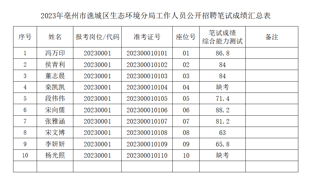 根據(jù)《2023年亳州市譙城區(qū)生態(tài)環(huán)境分局工作人員公開招聘》有關(guān)規(guī)定,現(xiàn)將筆試成績(jī)予以公示。后續(xù)具體事宜,請(qǐng)持續(xù)關(guān)注公司微信公眾號(hào)。 聯(lián)系電話:0558-5551238
