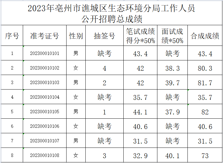 2023年亳州市譙城區(qū)生態(tài)環(huán)境分局工作人員公開招聘總成績公示