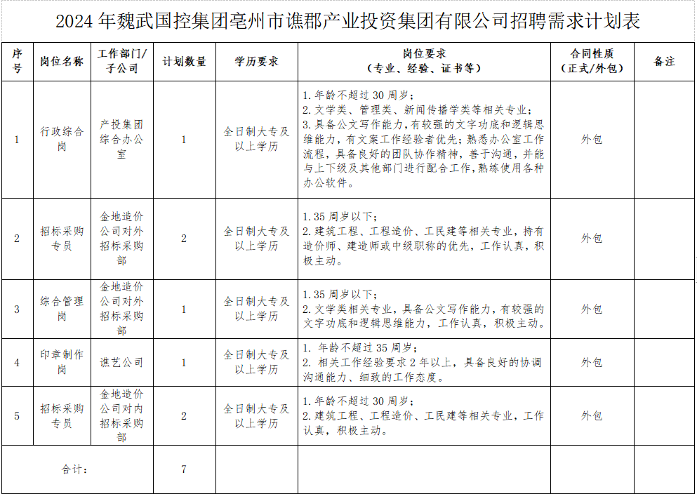 因工作需要,現(xiàn)委托亳州市譙騰人力資源管理有限公司面向社會招聘外包崗位人員7名;現(xiàn)將有關(guān)招聘事宜公告如下: