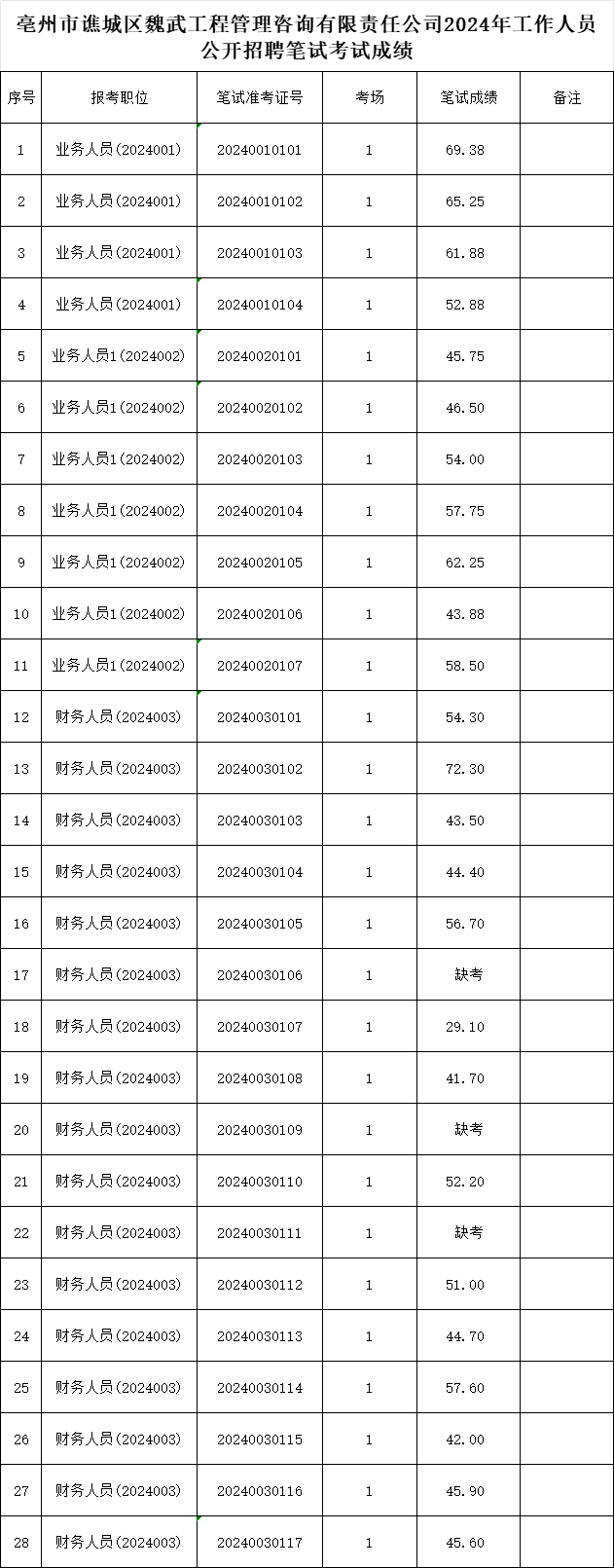關(guān)于亳州市譙城區(qū)魏武工程管理咨詢有限責(zé)任公司2024年工作人員公開招聘筆試考試成績公示